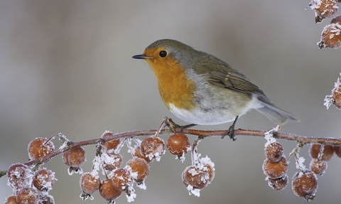 Robin (Erithacus rubecula) adult perched on crab apples in winter, Scotland, UK - Mark Hamblin/2020VISION